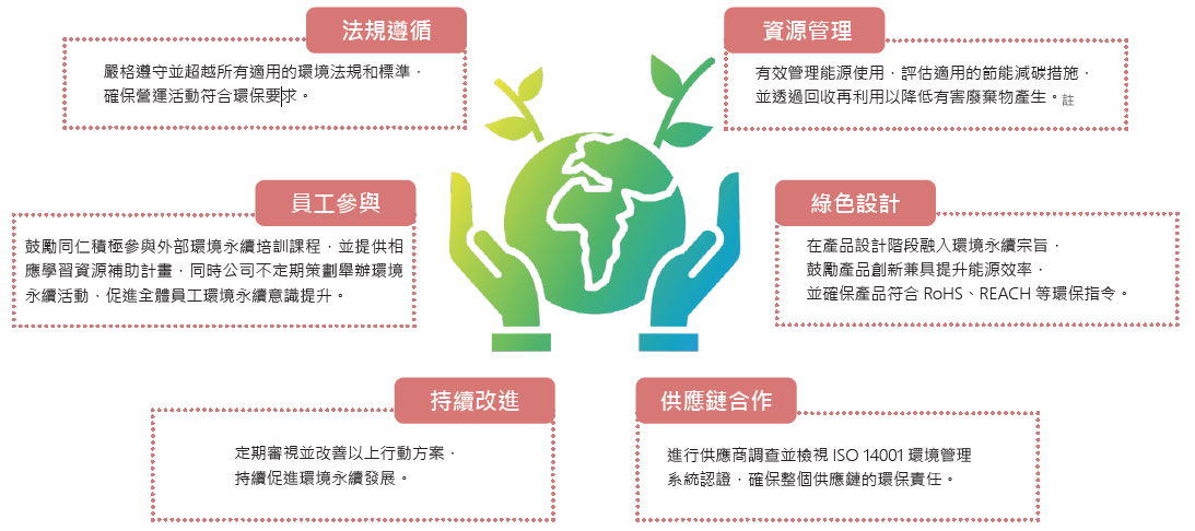 本公司專注於低功耗與高效能產品設計,透過技術創新提升能源使用效率,協助降低產品使用階段之能耗與溫室氣體排放,並支持客戶共同因應氣候變遷。 |