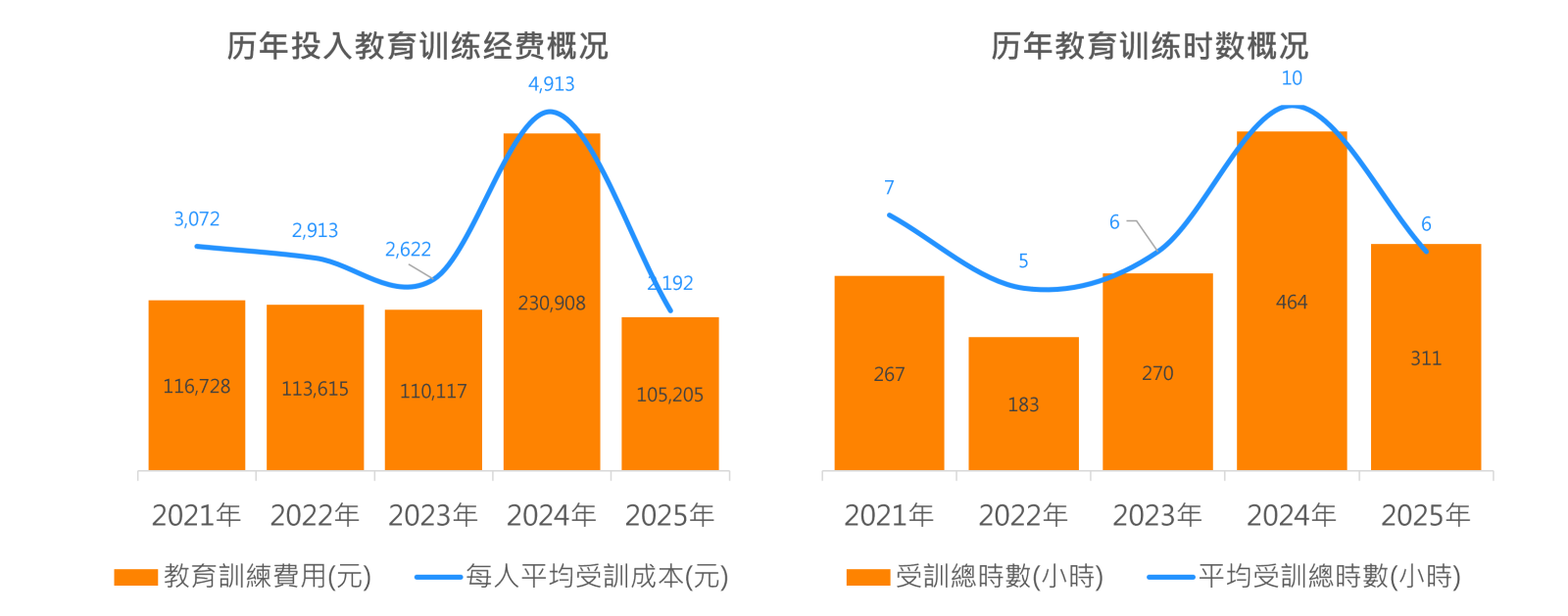 2025 年来颉科技(台湾)持续投入教育训练资源,全年平均每人受训成本为新台币 2,192 元,平均每人受训时数为 6 小时,展现公司对人才培育与组织发展的长期承诺。虽然 2025 年训练发展绩效指标较 2024 年略有下滑,主要系因组织结构调整、内部训练比例提升所致。