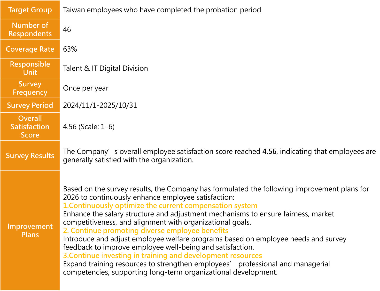 Starting in 2025, the Company conducts an annual Employee Satisfaction Survey to understand the organizational climate, identify key issues, and formulate corresponding improvement plans. We are committed to strengthening communication channels with employees, valuing their feedback, and incorporating their opinions into decision-making processes.